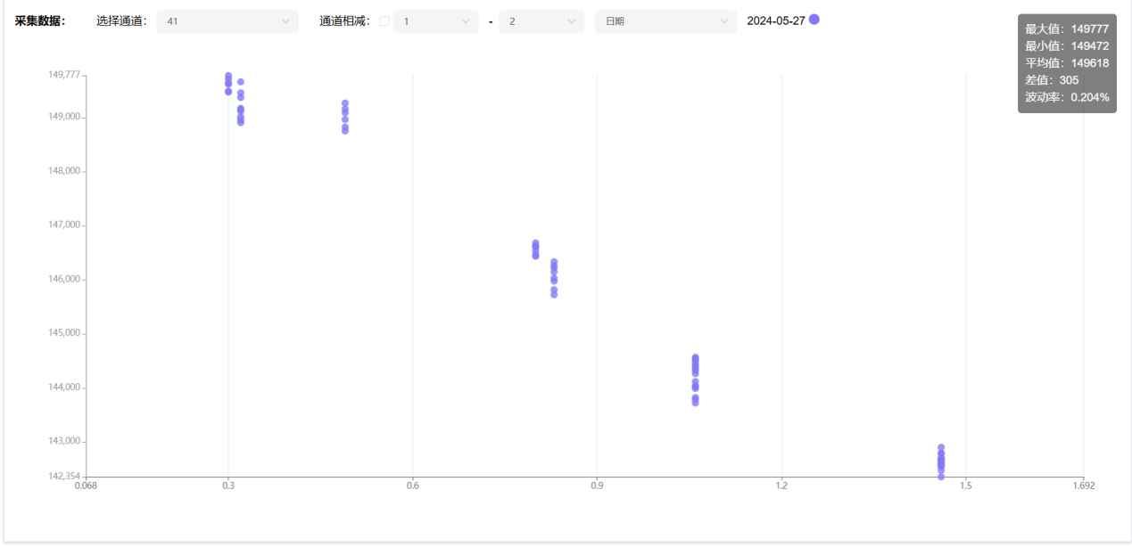 由上圖可知,含水量在1500nm波段有明顯的相關性,相關性高達0.95,且躁信比較低,為0.82。通過檢查該波段的落點圖,發現有較好的線性關系,落點圖如下圖所示: