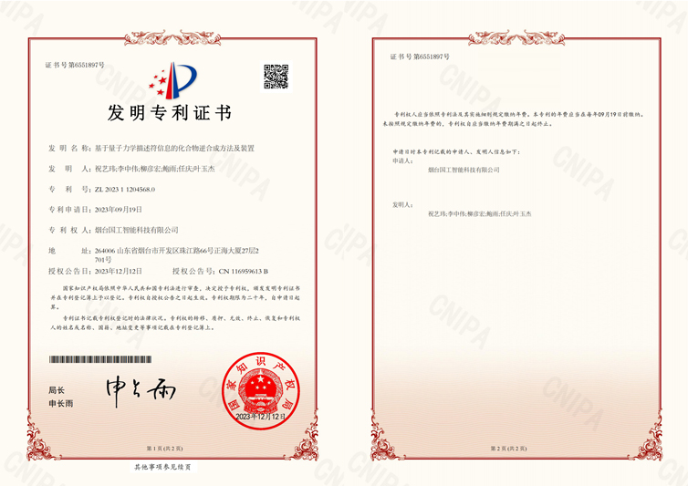 近日,國工智能新添國家知識(shí)產(chǎn)權(quán)局頒發(fā)的一項(xiàng)發(fā)明專利證書“基于量子力學(xué)描述符信息的化合物逆合成方法及裝置”。